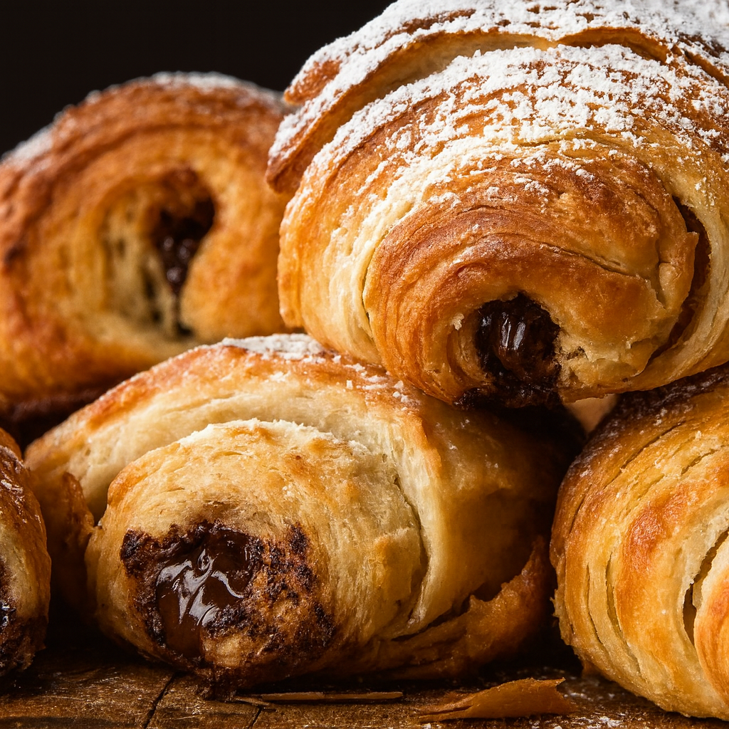 Layers of golden, flaky pastry unfold with a warm, buttery aroma, capturing the essence of freshly baked dough. At the heart, ribbons of velvety hazelnut chocolate spread melt into the layers, rich and nutty. A lingering base of roasted cacao and soft vanilla leaves a decadent, patisserie-like trail.