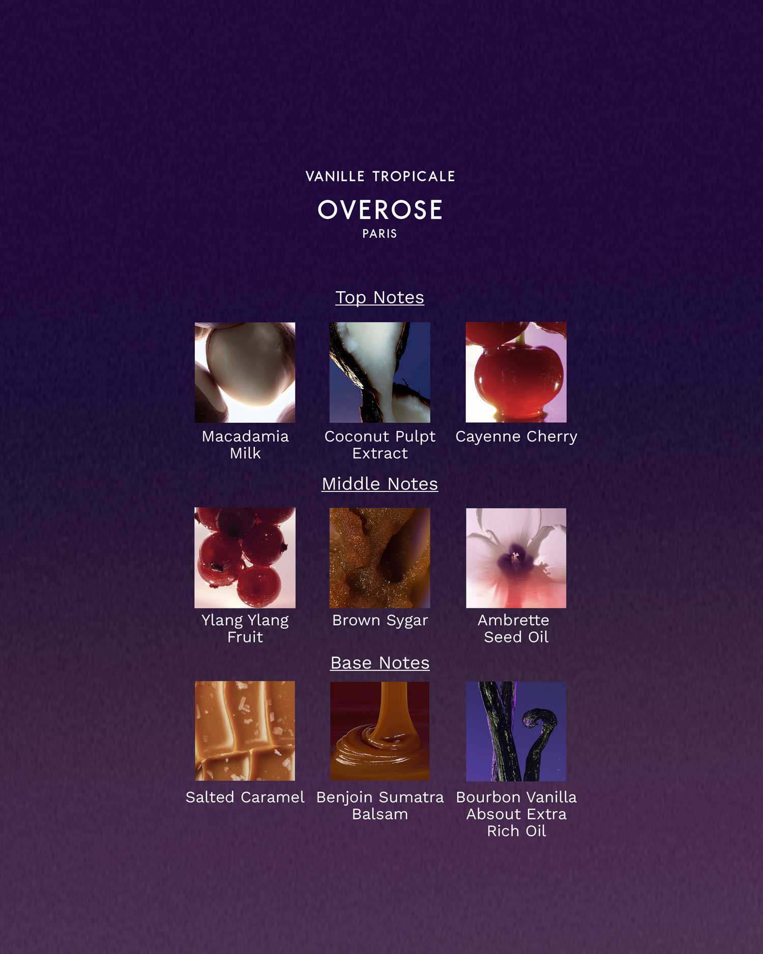 At the base: rich Bourbon vanilla absolute and sensual benzoin resin melt into skin bringing deep lasting sweetness.